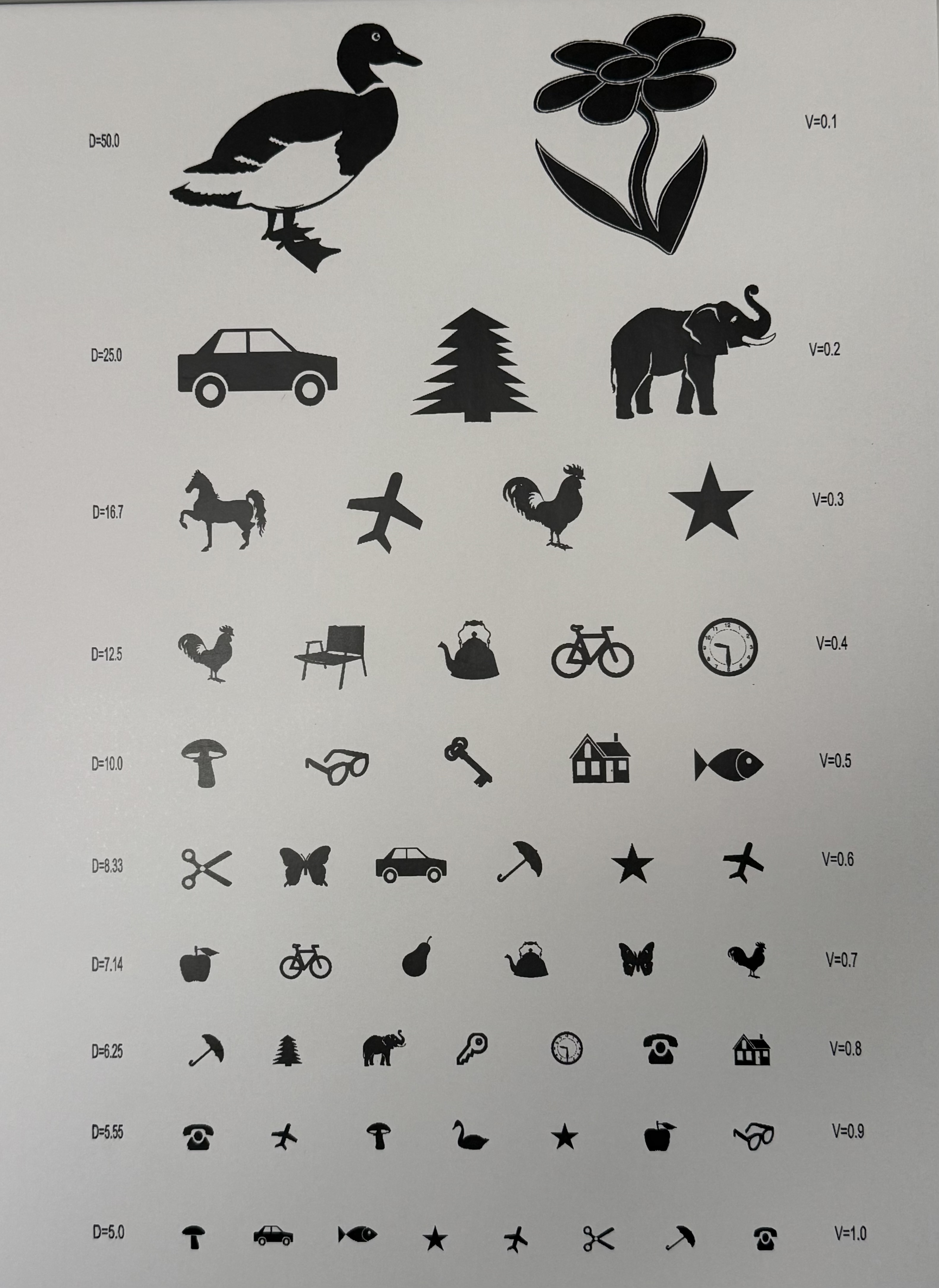 Orlova tables are tables used to determine visual acuity in children of preschool age and primary school age. They differ in that they depict pictograms familiar to children, arranged in seven rows - five in the top row and eight in the bottom row. Opposite each row is the distance from which the child with a normal level of visual acuity should be able to see pictograms.