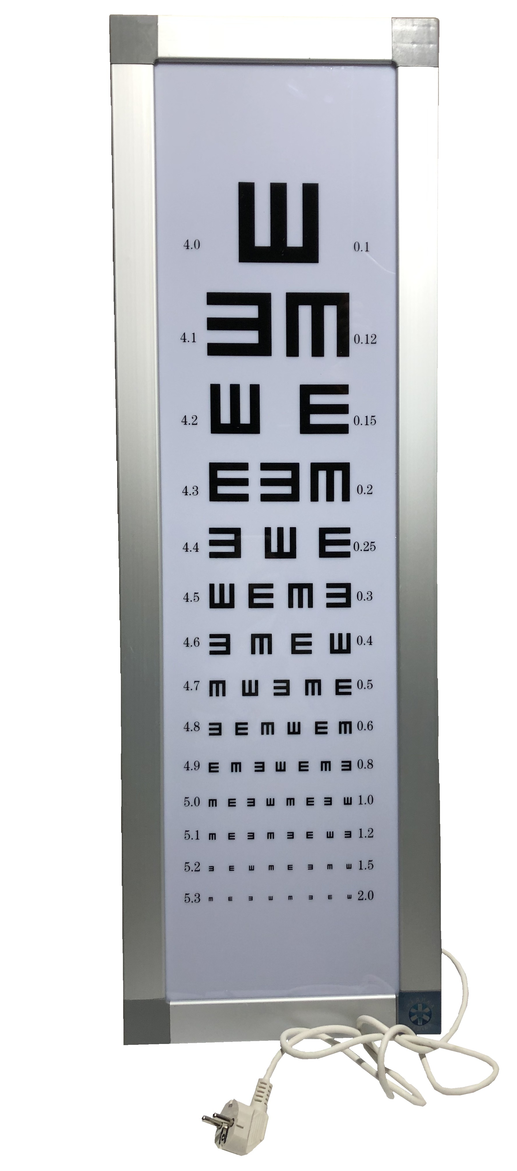 On the front opening lid there is a translucent screen measuring 90*30 centimeters. On a white screen, W-shaped optotypes are applied in rows with black paint at different angles. Opposite each row, visual acuity indicators are marked with symbols - from 0.1 to 5.3. During the examination, the patient should be located at a distance of five meters from the screen.